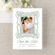 Announce your wedding with this elegant green ornate frame photo save the date, featuring a hand-drawn antique picture frame that surrounds the couple’s vertical engagement photo. “Save the Date” is displayed in graceful calligraphy, paired with classic serif lettering for the couple’s names, wedding date, and location, creating a refined and balanced layout. The green frame adds a natural, grounded tone while maintaining a timeless, artistic feel that works beautifully across both traditional and modern wedding styles. Ideal for classic weddings, black tie ceremonies, and elegant venues, this personalized photo save the date offers a polished way to share your wedding date.