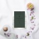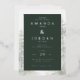 This elegant wedding invitation features a sophisticated dark green background with subtle marbled textures framing the design, creating an inviting contrast. The layout is clean and modern, utilizing serif fonts to emphasize key details like the couple's names and event information. Delicate illustrations of pine trees add a natural touch, enhancing the overall theme of classic elegance blended with contemporary minimalism. Perfect for couples seeking a refined yet warm atmosphere, this invitation sets the tone for an intimate celebration.