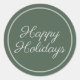 Elegant green "Happy Holidays" classic round sticker with calligraphy script text.  Contact us for help with customisation or to request matching products.