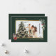Elegant custom watercolor photo Christmas cards featuring a dark green photo frame decorated with watercolor illustrations of poinsettia, lantern, and ornaments on a pine tree branch with pine cones. Easily personalise these elegant watercolor Christmas photo cards with your image and text.
