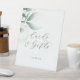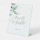 This elegant greenery cards and gifts pedestal sign is perfect for a simple wedding or bridal shower. The modern elegant design features a natural botanical arrangement of eucalyptus, leaves and plants with a subtle mint green watercolor wash accent. The line of text at the bottom of the sign can be personalised with the date, the names of the bride and groom, or a short message like "Thank you". This sign can be used for a wedding or any event or party.