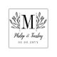 Inking stamp for your wedding with your soon to be shared initial flanked by greenery for an elegant monogram. Your names beneath in a lovely script along with your wedding date in elegant numbers.