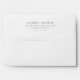 This wedding envelope features a minimalist and elegant design with centred text on a plain white background, creating a clean and sophisticated look. The muted greenish-grey colour palette enhances readability while conveying a sense of understated elegance. Utilising modern sans-serif typography, the layout emphasises clarity and simplicity, making it perfect for formal announcements. The absence of additional graphics or textures highlights the focus on personal identification and location details, ideal for couples seeking a contemporary and refined aesthetic for their special day.