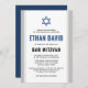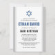 Modern, blue, white and light grey bar mitzvah invitations. You can change the font, border and background colours with the design tool. Above the invite text is a blue Star of David. For more products, custom requests, sales, news and more, please follow us on Facebook: @chaistationery