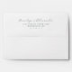 This wedding envelope features a minimalist and elegant design with a clean white background. The names are elegantly displayed in flowing cursive script, while the address and contact details are presented in a crisp sans-serif font for readability. The monochromatic colour palette of dark grey to black adds sophistication, making it perfect for formal correspondence. Its modern and refined aesthetic ensures clarity and an understated elegance, ideal for conveying essential information effectively.