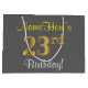 This simple, elegant birthday gift bag design features a personalised message like "NameHere’s 23rd Birthday!" (with the "23rd" having a faux/imitation gold-like colouring look) on a grey coloured background. The name is in script-like, yellow-coloured text, and can be customised. A personalised birthday gift bag like this could perhaps be used when giving a present or gift to somebody who is celebrating their twenty third birthday. [~Z0000261]