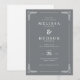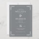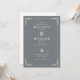This elegant wedding invitation features a sophisticated, symmetrical layout with a muted grey background and white text for contrast. The design includes ornate leaf motifs in each corner, adding a touch of natural refinement to the classic aesthetic. Serif fonts are used throughout, enhancing the formal and timeless feel, while ample negative space ensures clarity and focus on the essential details. Perfect for a traditional celebration, this invitation conveys an air of sophistication and anticipation.