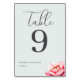 This wedding table card features a minimalist design with a soft, light grey background that creates an elegant and serene atmosphere. The layout includes the word "Table" in cursive script at the top, followed by a large, bold number "9" as the focal point. A delicate pink lotus flower adds a touch of natural beauty to the bottom right corner, balancing the composition. Customisable text fields allow for personalisation with names and dates, making it perfect for adding a personalised touch to your special day. The overall style is understated yet sophisticated, ideal for creating a refined ambiance at your wedding reception.