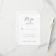 This elegant wedding RSVP card features a minimalist design with ample white space, creating a clean and sophisticated look. The layout includes a prominent cursive "RSVP" at the top, followed by a formal serif font for the response instructions. Personalisation options are seamlessly integrated, allowing for a name and number of attendees to be added. The restrained colour palette of dark grey or black on crisp white enhances its classic style, making it perfect for conveying refinement and simplicity at your special event.