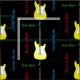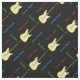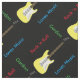 Elegant Guitar Print Fabric .With a black background colour you can change. From the custom tag to what ever colour you like. With the text in three colour to edited as wish.