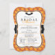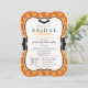 Elegant Halloween theme bridal wedding shower invitation on orange pumpkin pattern. Features a black bat header with spider web and pumpkin pattern. Great invite for October bridal showers.