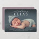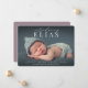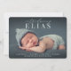 An elegant birth announcement design featuring a full bleed horizontal or landscape orientated photo with "introducing [name]" at the top in chic white calligraphy script and classic serif lettering. Your baby's full name, birth stats, and your family signature appear along the bottom. Add three additional square photos to the back.