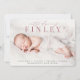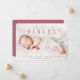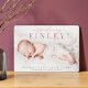 An elegant birth announcement design featuring a full bleed horizontal or landscape orientated photo with "introducing [name]" at the top in chic calligraphy script and classic serif lettering. Your baby's full name, birth stats, and your family signature appear along the bottom. Add three additional square photos to the back.