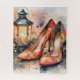 This beautifully illustrated Christmas-themed puzzle features a pair of elegant high-heeled shoes in vibrant shades of red, orange, and yellow, adorned with delicate golden lines. The shoes are positioned in front of a charming, vintage-style lantern that emits a warm, inviting glow. The background is a whimsical blend of soft, watercolor hues, with festive string lights and abstract splashes of colour adding to the holiday spirit. This puzzle captures the essence of Christmas elegance and festivity, making it a perfect gift or decoration for the holiday season.