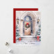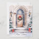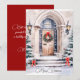 This sophisticated Christmas card features a stunning watercolor illustration of a grand architectural entrance, beautifully decorated for the holidays with a festive wreath, glowing lanterns, snow-dusted evergreens, and charming red bows. With a solid red background and customisable text on reverse, you can add your family name or a special message, making this card uniquely yours. Send a truly memorable and elegant greeting this season!