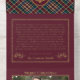 A luxurious blend of dark cranberry red and real gold foil sets a tone of timeless elegance, beautifully contrasted by a rich, classic plaid on the top inside flap in shades of dark cranberry red, dark teal green, and deep navy, subtly accented with faux gold threads along with a simple foil snowflake encased in a double circle. Simple holly and berries motifs framed in a refined rectangular border adds a traditional touch to the front center—creating a striking yet understated Christmas letter that’s ready to shine with your personal details. The bottom features your single photo along with your seasonal greeting, the year and name(s) in foil. The outside (back) features a repeat of the dark cranberry red background overall background and faux gold text to coordinate with the inside. Your return address is accented by an emblem created with the holly motif and your monogram initial in center. Perfect for your holiday gatherings from personal to corporate celebrations.