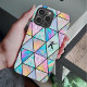 Elegant holographic chic geometric iPhone 16 Case. This iPhone case features an abstract pattern of holographic triangles that shimmer with an iridescent glow, shifting from pink to blue to yellow as light moves across the surface. The geometric design creates a modern, high-tech feel, with each square adding depth and a touch of mystique.