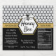 Give your honey jars a polished, professional look with this Honey Bee Honey Jar Label. Designed with a striking black, white, and gold colour scheme, this label features a modern honeycomb pattern, a bold hexagon frame, and a charming bee illustration—perfect for showcasing your handmade, 100% pure honey. The label layout includes important details such as product information, nutrition facts, and your business name, creating a complete, cohesive presentation for your honey products.