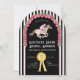 This Derby party invitation has a watercolor race horse with a jockey in pink on a black arched background adorned in red roses. The date is featured inside a race ribbon and all the other party details are in white text. The back features a horse race backdrop pattern.