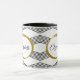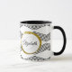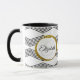 You can easily personalise this mug design featuring a black and white zig zag background with a gold glitter calligraphy circle and template text. Fill in the template fields which will change the text on both sides or click customise to select a typeface style, size, and colour you like.