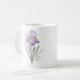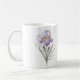 This elegant ceramic mug features a minimalistic watercolor illustration of a beautiful iris flower in soft purple, violet, and pink tones, accented with delicate line art. It embodies peaceful charm and includes a poetic quote, making it perfect for refined sips and a serene atmosphere.