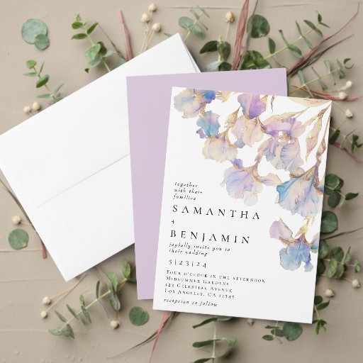 This elegant wedding invitation is perfect for spring and summer weddings. This design features watercolor irises in shades of lilac and periwinkle blue. Subtle touches of gold add a glistening, magical element.