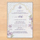 At the heart of the design is a symbolic Islamic arch with intricate lattice detailing, representing unity and faith. A warm, vintage-inspired backdrop adds a subtle sheen, while muted purple floral accents bring romantic softness. Together, these layered design elements rest elegantly on the clear acrylic canvas, resulting in a sophisticated and memorable invitation that stands out beautifully.