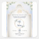 Celebrate your special day with grace and tradition using this beautifully crafted Islamic wedding invitation card. The design features elegant Arabic calligraphy of “Bismillah ir-Rahman ir-Rahim”, framed in a delicate mosque-style arch with soft floral accents and gold details.