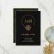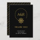 This gold and black elegant Thank You card wedding features the couple's initials printed on a black background in a stylish font, framed by a wire choker-inspired design with a floral accent. The back of the card is just as impressive, featuring a diagonal pattern of the couple's names in luxurious gold on black.