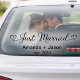 Make your just-married status a sweet statement with our "Just Married Hearts" black script Window Cling. This fun car window sticker adds a touch of elegance to your celebration, featuring a beautiful script font decorated with heart tails. Place it on the back of your car, and let the world know about your special milestone in the most stylish way.