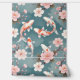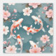This design features elegant koi fish gracefully swimming amidst blooming cherry blossoms on a serene teal background. The koi are primarily white with vibrant orange-red markings, creating a striking contrast against the soft pink petals of the flowers. Delicate cherry blossom branches frame the scene, adding a touch of tranquillity and natural beauty. The overall composition evokes a sense of peace, harmony, and traditional Japanese aesthetics.