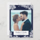 This design features a deep navy blue background with ornate faux white lace in the corners on back and front. One side of the design features a modern template to easily add custom engagement photo, the couple's first names and wedding date. On the reverse side, personalise wedding design with your custom details in elegant red lettering and script.