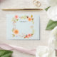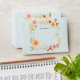 Soft powder blue lace background with hand painted watercolor artwork of blush and peach flowers with flower buds, fern leaves and autumn hued foliage.
