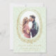 This pink save the date is perfect for announcing your upcoming wedding date. The design features an antique laurel wreath frame around your engagement photo. The design is on a light green damask background.