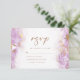 The edges of this elegant modern RSVP card features a lavender watercolor border design in imitation of marble veined with faux gold foil, fading gradually into the white background. The letters "rsvp" appear in gold-coloured handwriting script. The customisable response date and wording are in charcoal grey serif text. The reverse side features a matching lavender and gold marble design.