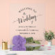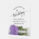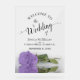 Welcome your wedding guests with this beautiful acrylic sign. The romantic design features a single long stemmed light purple or lavender coloured rose lying on its side mirrored in a pool of water. The elegant script calligraphy title includes lacy swashes or flourishes on the ends of the letters, and the names of the couple and wedding date appear below.
