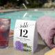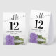 These tent signs will not only help your guests find their tables, they'll also make your wedding reception more beautiful. The design is both elegant and romantic featuring a single lavender purple coloured rose lying on its side reflecting in water with waves and ripples. The title is in lacy script calligraphy with bold numbers so your guests can easily find the right table. There is room for the names of the couple and the wedding date.