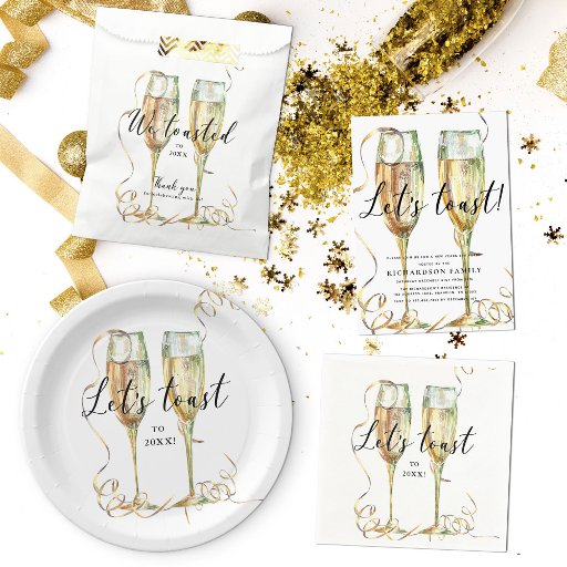 This is an elegant and modern, budget friendly New Years Eve Party invitation on a flat sheet. The design features a pair of watercolor champagne glasses and a call to your invited guests to celebrate the dawn of the new year with “Let’s toast!” in a modern script font.