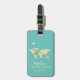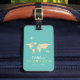 A nice and personalised light teal colour luggage-tag with the map of world and an aeroplane
