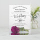 This gorgeous wedding invitation features a modern floral design with a single long-stemmed cassis purple, magenta, red plum, or berry coloured rose lying on its side reflecting in a pool with waves and ripples. The design is simple, elegant, romantic and sophisticated, with lacy script calligraphy and fully customisable content.
