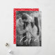 Elegant Valentine's day card featuring your vertical photo with "love" displayed in a white calligraphy script with an optional white gradient. Personalise the Valentine's day photo card with a custom greeting and your name. The photo Valentine's day card reverses to display a playful red and white heart pattern.