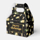 This is a black and gold party favour box in modern black with Merry Christmas in a bold and elegant gold typography. The pattern features celebratory champagne flutes, streamers and gold Christmas ornaments.