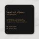 Professional chic, luxury business card with glamourous faux gold geometric square conatains monogram initials and sugnature full name in centre in front with an artistic brush stroke painting against black background and social media accounts with icons.