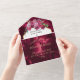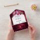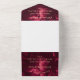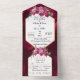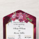 magenta pink and Burgundy flowers and leaves Wedding All In One invitation. This pretty Wedding All In One design showcases a gold frame with a watercolor roses and foliage in pink and Burgundy colours. The back is a rose in magenta pink colour.