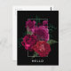 A hello postcard with a beautiful image of a bouquet of magenta and pink flowers. Black background.