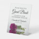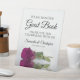 This beautiful pedestal sign will invite your wedding guests to sign your guest book. Features an elegant design with a single long-stemmed magenta plum, cassis purple, or berry coloured rose lying on its side mirrored in a pool of water. There is space for the names of the couple as well as the wedding date.