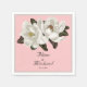 Celebrate a wedding or special event with an elegant watercolor of ivory magnolia blossoms on a pink background. Click the custom button to change names, dates.