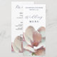 Elegant Magnolia Pink and White Wedding Menu card for your Reception Dinner Accessories. Designed with a soft pink and white magnolia flower on both front and reverse. The front side text includes: The Bride and Groom's First Names, Wedding Date, and Wedding Menu. The reverse side text includes: Appetizer, Entre and Dessert Selections. To personalise, simply insert your details into our easy template, replacing the sample text.