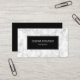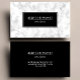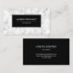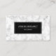 A chic, trendy black and white business card design featuring a grey and white marble pattern background. Personalise it with your name and title in white on a black rectangle. On the reverse side, add your name, title, and contact details in white on a black background.