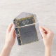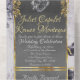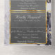 This elegant All In One wedding invitation features a grey centre on a black and white marble background, framed with gold roses and leaves, embellished with a silver scroll heart.